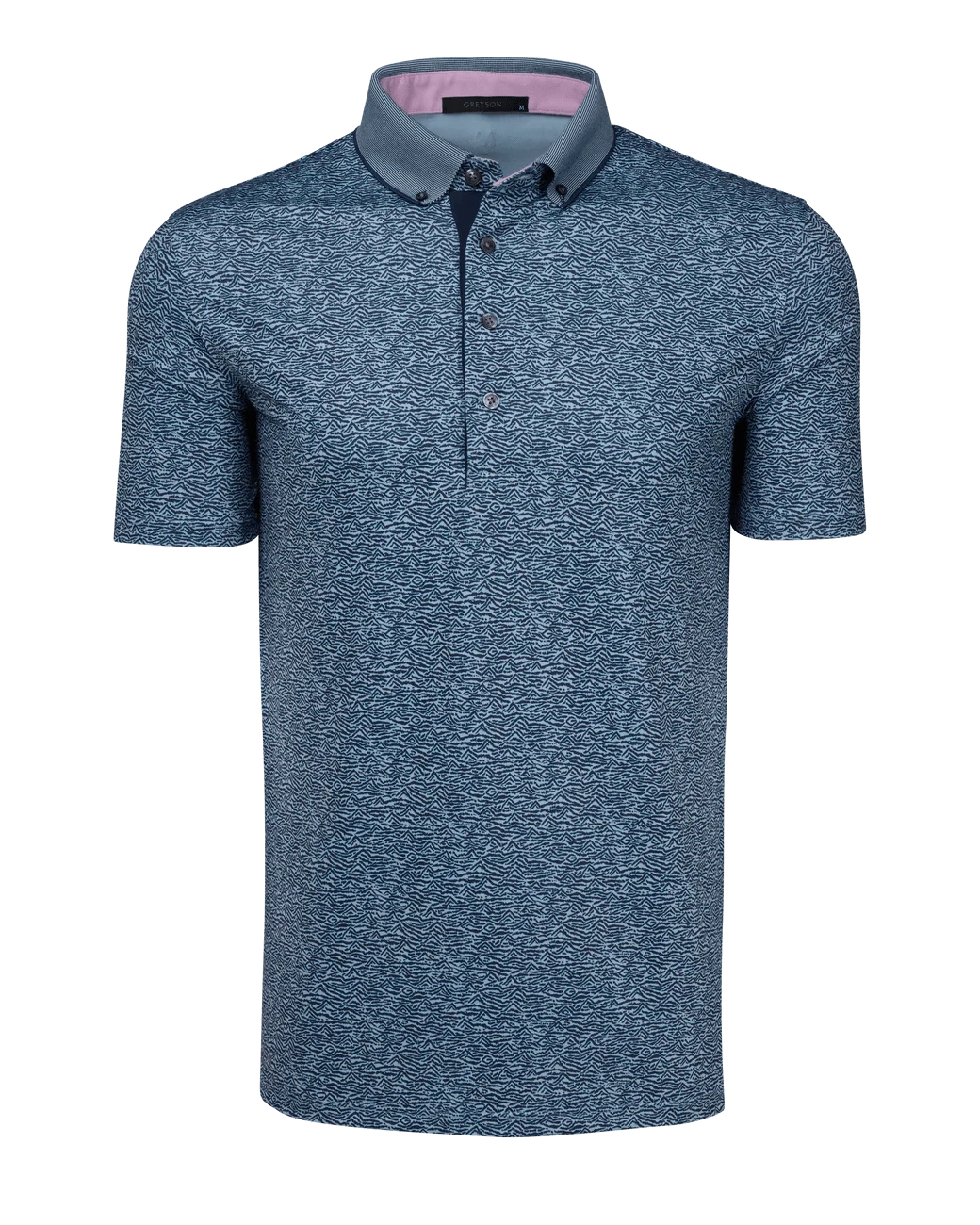 The Range Short Sleeve Polo is crafted from lightweight performance fabric that delivers breathability, quick-drying function, and anti-odor technology. Featuring an all-over abstract topographic print that nods to its name, it includes a button-down knit cutaway collar and a four-button placket with contrast detailing under and at the top for understated sophistication. The open hem and cuffs offer a comfortable fit that moves with you throughout the day, making it ideal for the course or everyday wear.