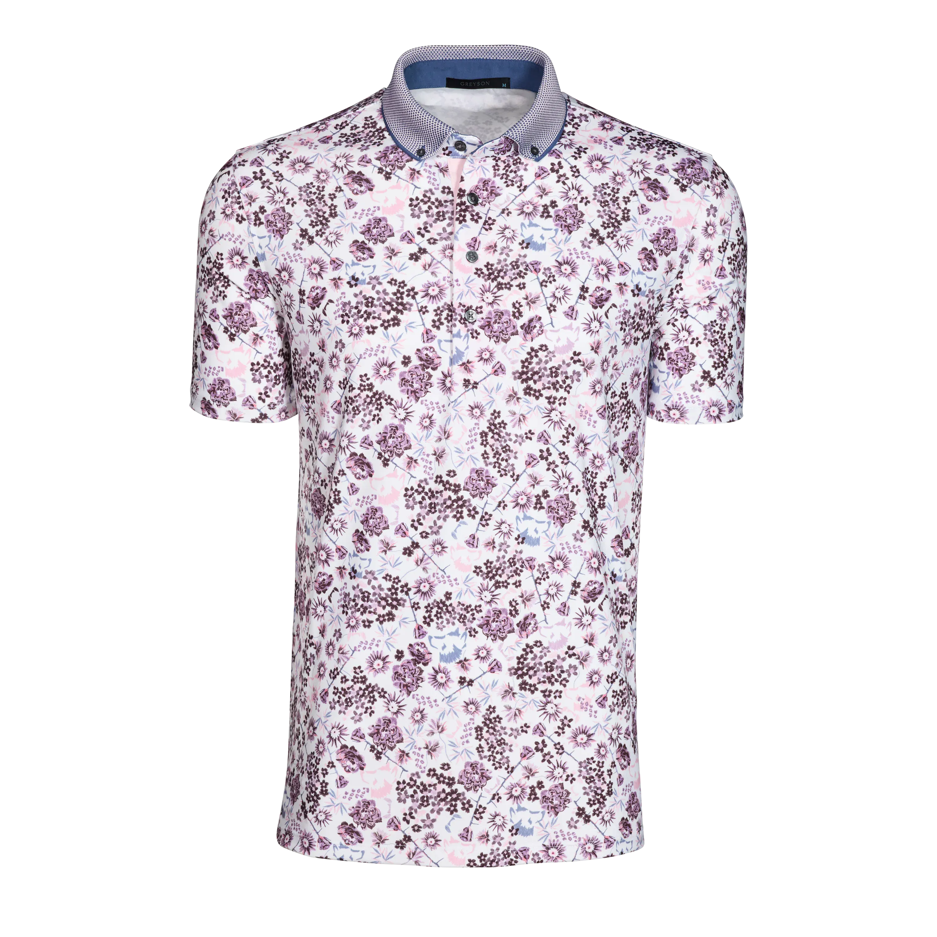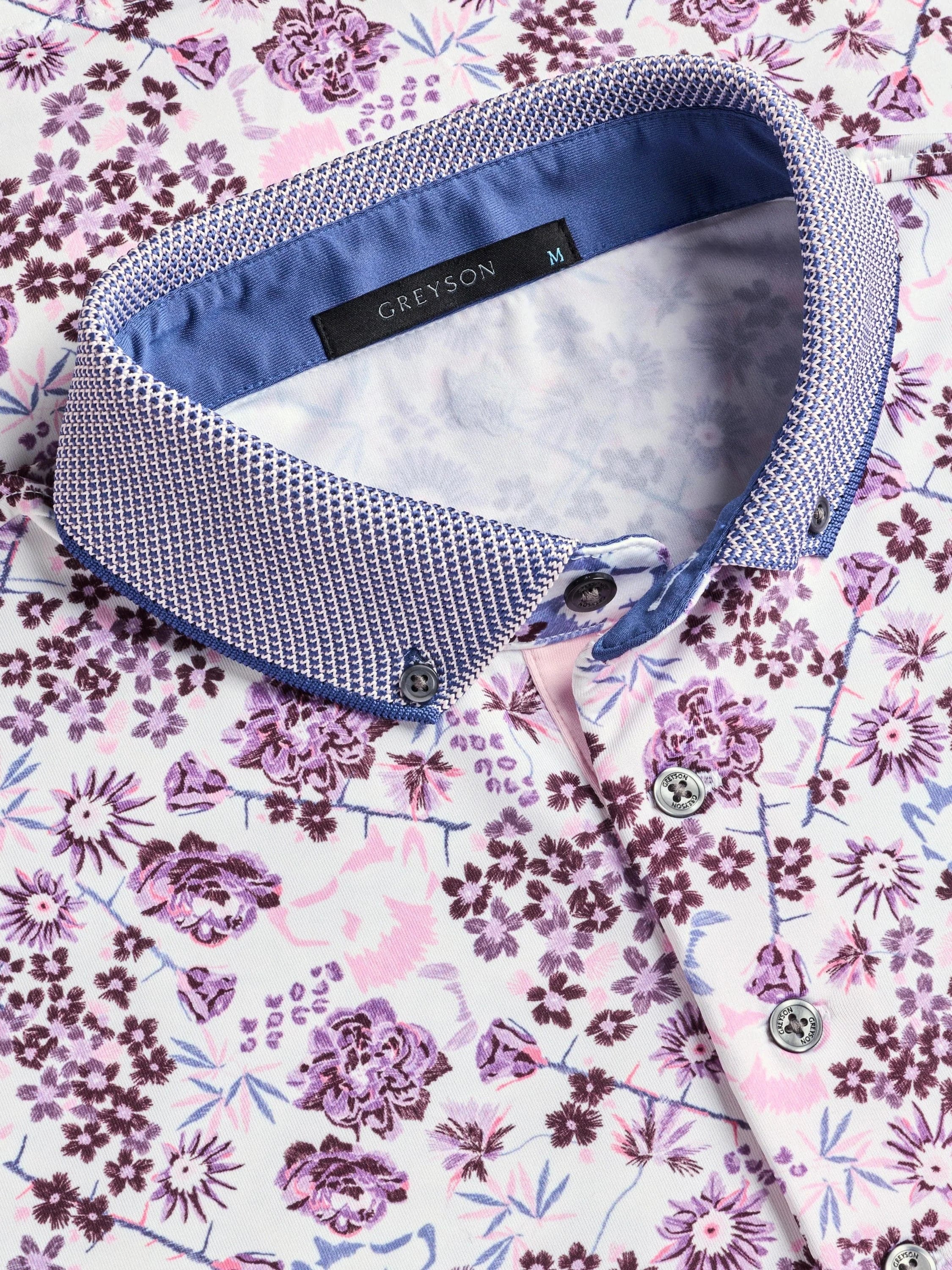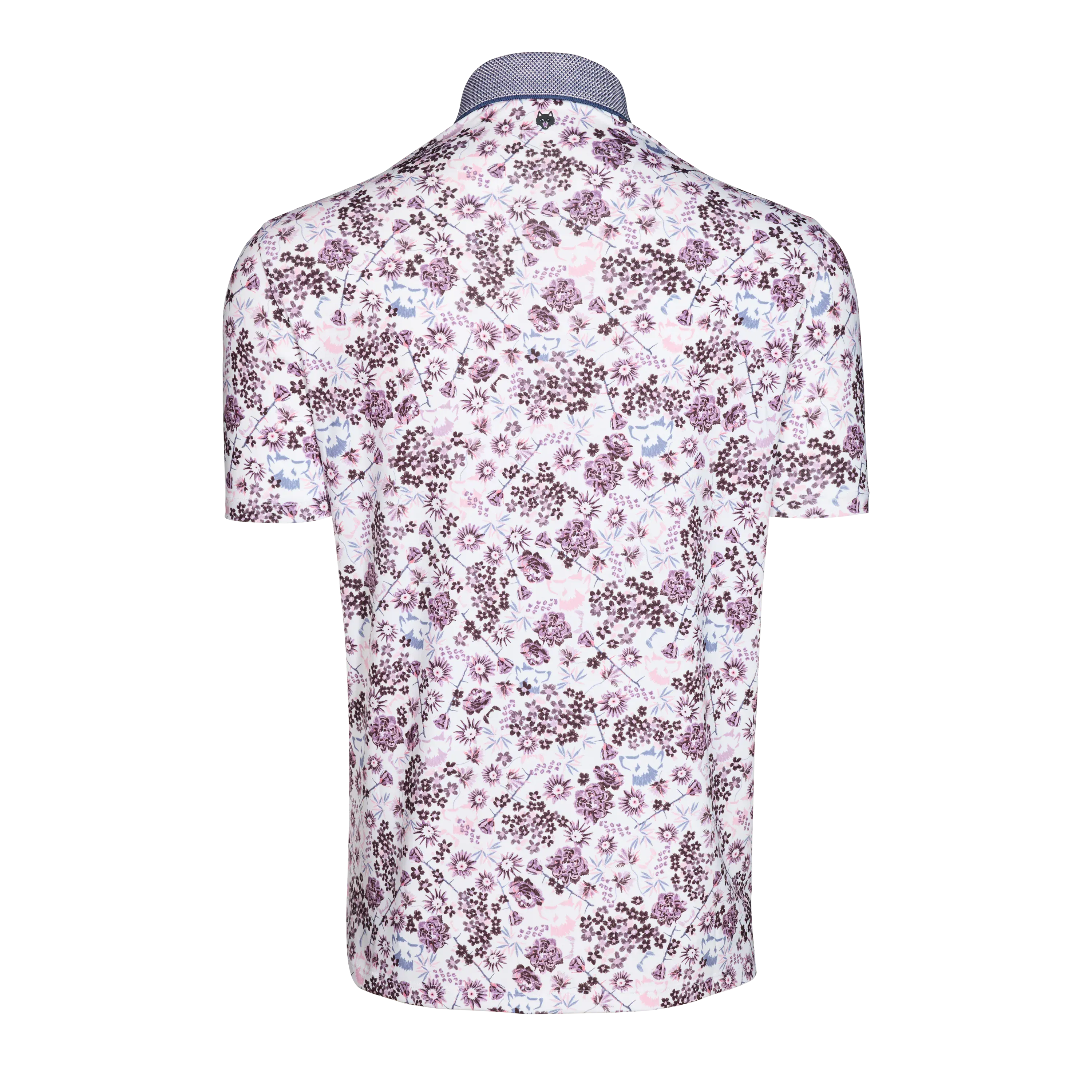 The Silver Fang Short Sleeve Polo features a refined floral-inspired print that adds depth and character to a modern performance silhouette. Crafted from a lightweight technical fabric, it delivers breathable comfort with moisture wicking and quick drying performance ideal for warm conditions. A button-down knit jacquard cutaway collar and clean placket create a tailored, elevated finish that balances the expressive print with a polished appearance. Built-in stretch supports ease of movement, making this polo well suited for golf, the office, travel, and everyday wear.