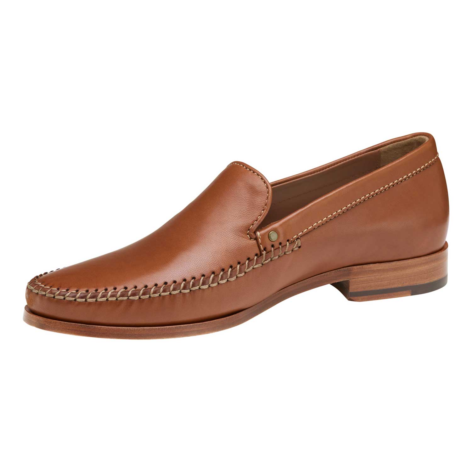 The classic lines of the Baldwin Loafer are crafted of soft sheepskin leather uppers with whipstitch details, full leather linings and cushioned footbed for comfort even without socks. Leather and rubber sole combination with stacked leather heel finish this Johnston & Murphy Collection staple.