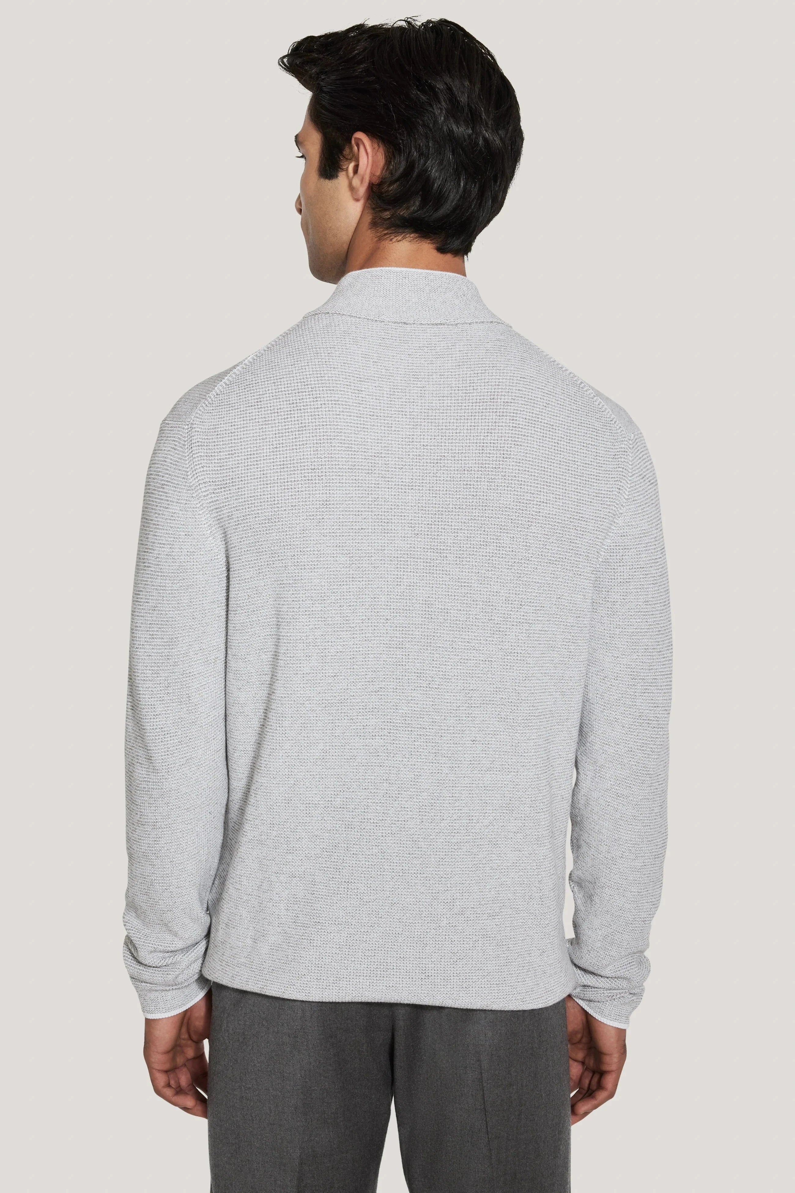 The Melange Quarter Zip Sweater is expertly crafted in Romania with ultra soft yarns for a textured knit effect. Its contemporary fit is made to be worn under a blazer or alone with trousers and is the ideal layering piece that adds value and versatility to your transitional wardrobe.