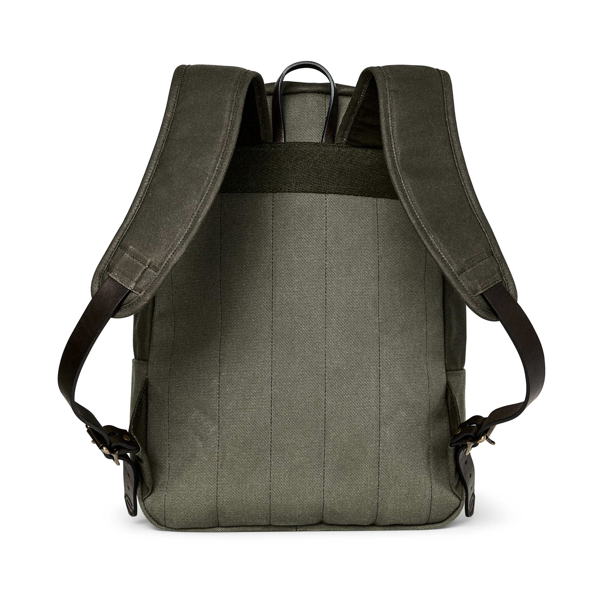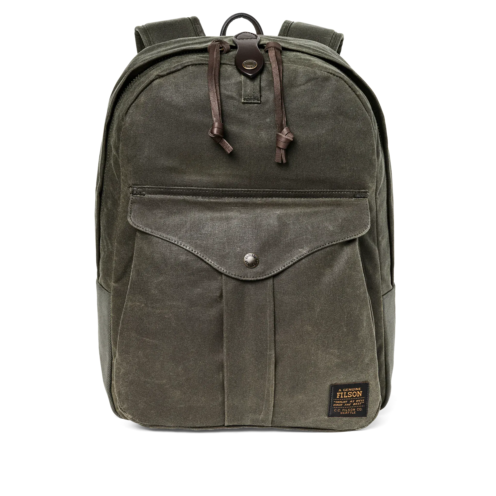Our Journeyman Backpack carries gear comfortably on the trail and is made with waxed Tin Cloth to protect your gear from wet weather. This tightly woven canvas duck has been thoroughly saturated with wax for water resistance. Our industrial-strength Rugged Twill on the back panel and base adds structure and durability. The padded shoulder straps are lined with Moleskin cotton for comfort and to minimize slipping. The straps are secured to the backpack with Bridle Leather that is strong enough for horse saddlery. The main compartment is accessed by a strong brass YKK zipper that extends more than halfway down the bag for easy access. An interior padded pocket fits laptops up to 15". The exterior pocket is expandable for increased capacity.
