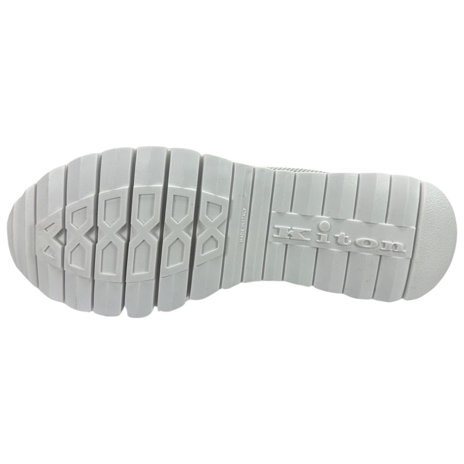 Ice Grey knit ''FIT'' running shoes. The one-piece upper of these trainers is made from Kiton knitwear fabric. Utterly unique, the graphic detailing created by the various knit stitches takes it to the next level. The white sole is flexible and extra-light, while the stretch tongue ensures increased comfort. The Kiton logo is embroidered and the stretch mesh laces feature Kiton's iconic red aglet. Made in Italy.