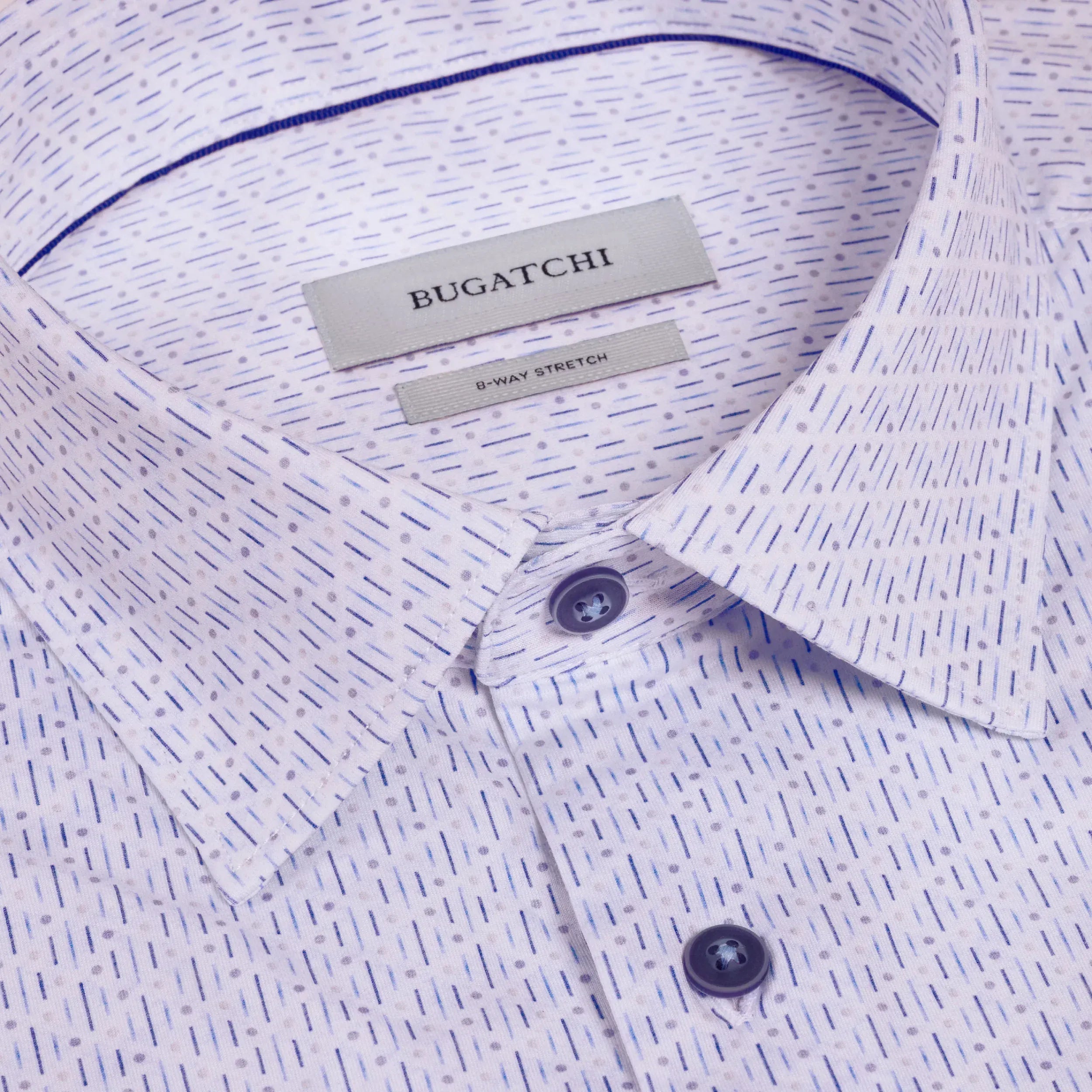 The James OoohCotton® long-sleeve shirt elevates everyday style with a geometric print, point collar, and a curved hem for a polished tucked or untucked look. Adjustable notched cuffs offer a customizable fit and convert to accommodate cufflinks. Made from our signature OoohCotton® double-mercerized performance fabric with 8-way stretch, moisture-wicking, quick-dry, wrinkle-resistant, and thermal comfort properties.