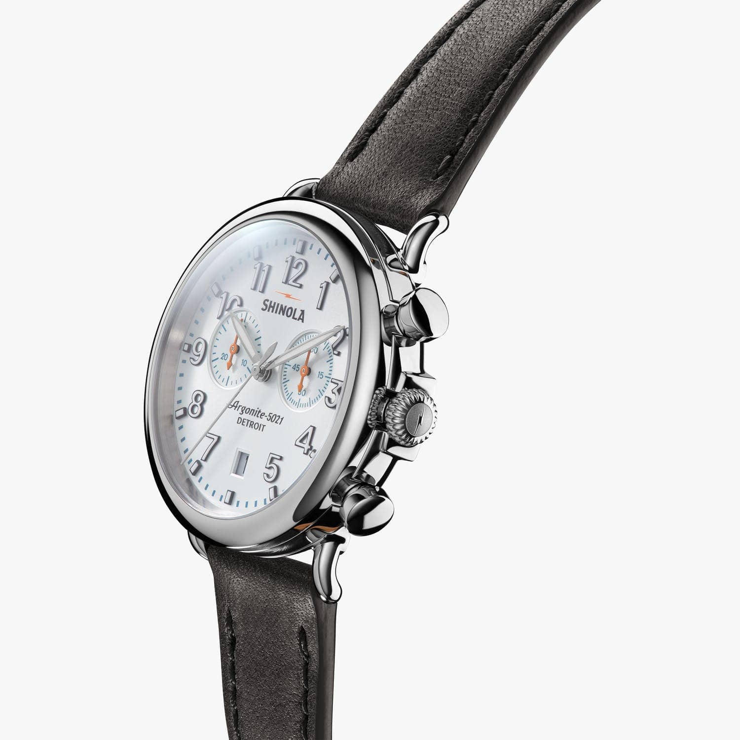 Subtle, stylish and a great conversation piece, this 41mm Runwell Chrono stands out with an understated, cloud blue sandblasted dial and two chronograph sub dials, powered by the complex Argonite 5021 movement. A pop of orange adds some fun while classic details like the polished stainless steel case, coin edge detailing, doubled-domed sapphire crystal and a black leather strap make this timepiece a cool classic.