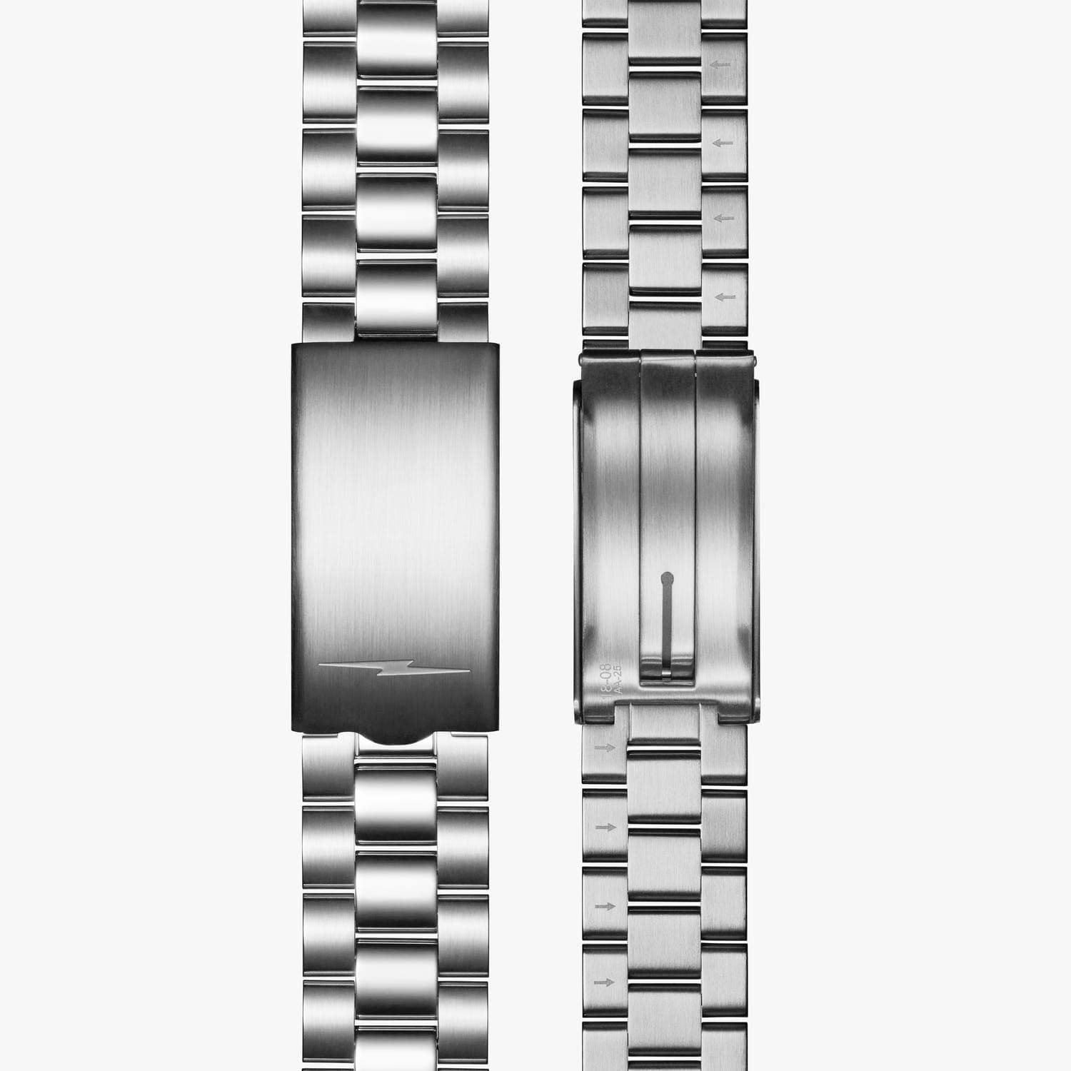 - WATCH STRAP: Three-link stainless steel bracelet.